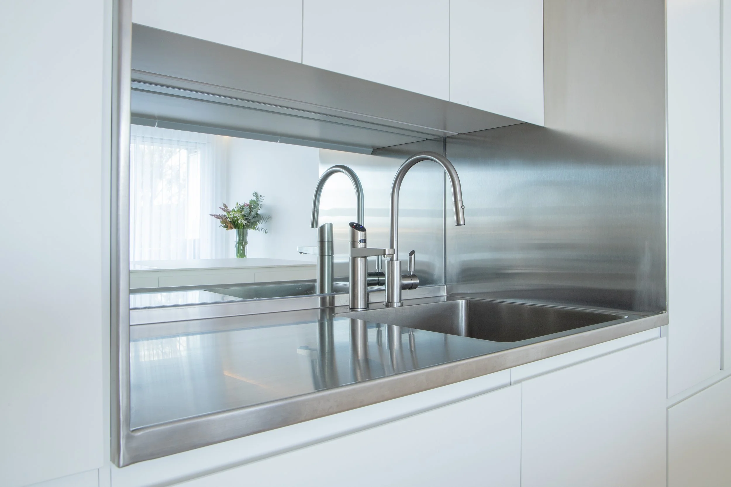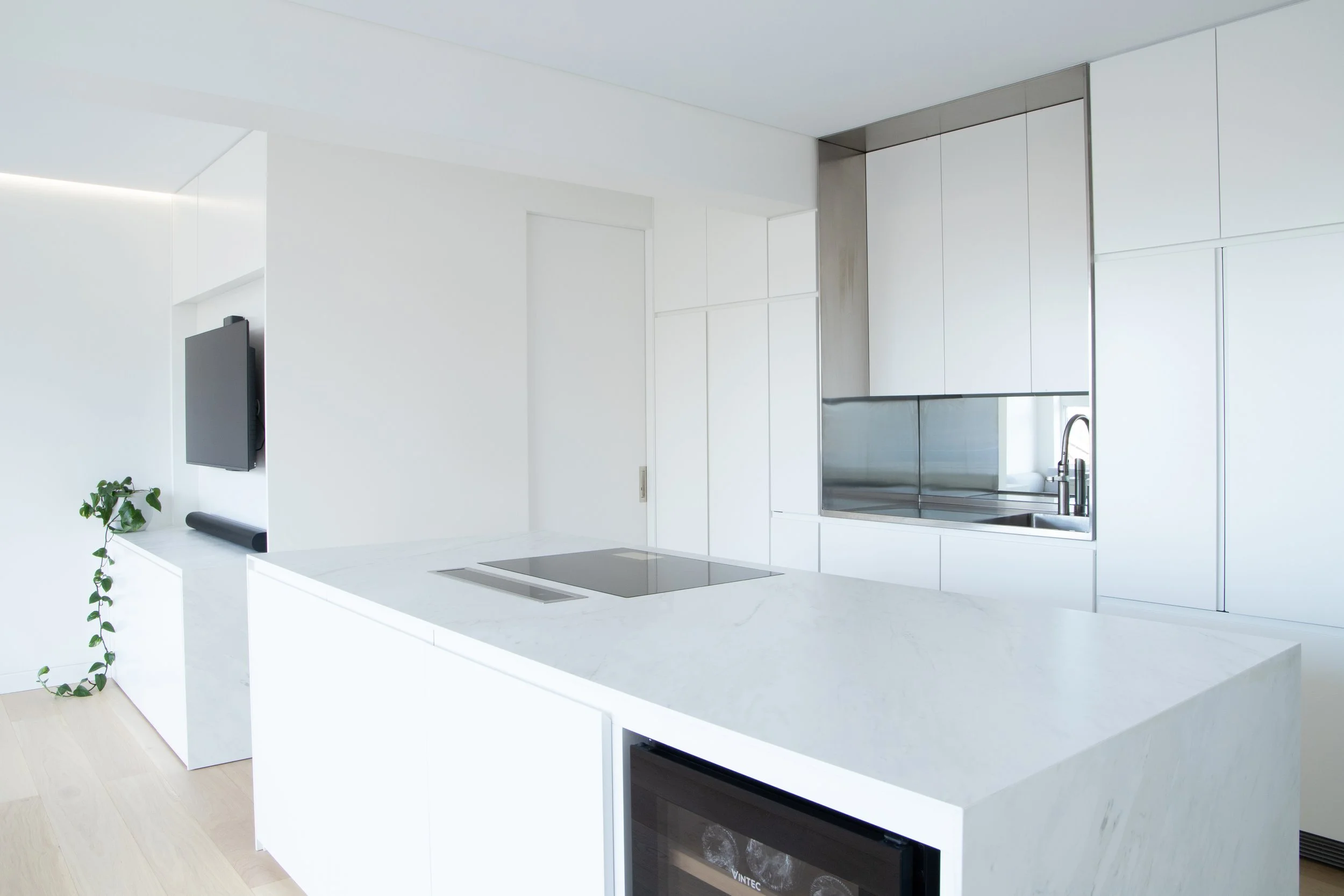 The kitchen was relocated from a rear room to the front , and dividing wall blocking the views removed . At a small 60m2 of floor space, the team conceived of this apartment renovation project as” building a boat “. Carefully detailed precision joinery maximises every centimeter of storage space , fitting state of the art appliances and always returning to the amazing views.